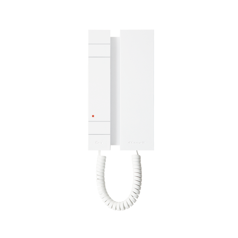 Citofono serie Mini con cornetta per sistemi audio Simplebus 2. E' dotato di pulsante apriporta, pulsante per servizi aggiuntivi come ad esempio, chiamate verso il centralino di portineria..., regolazione del volume di chiamata, modalità Silenzioso (Privacy) e di ingresso per la chiamata al piano. L'aggancio della cornetta alla base di appoggio è agevolato da inserti calamitati invisibili.