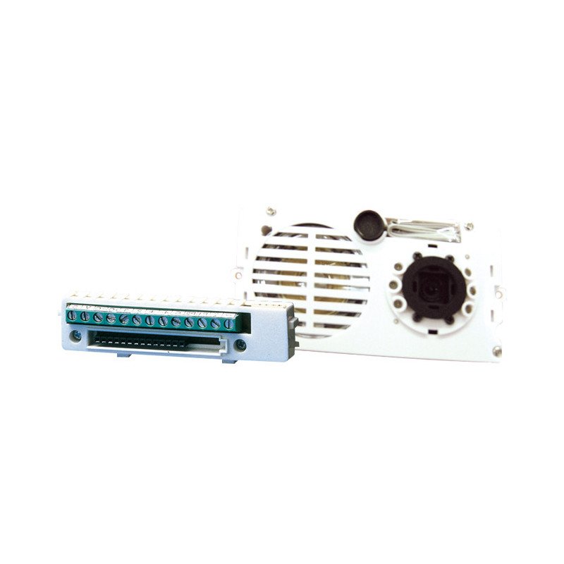 Gruppo audio-video per sistema Simplebus 2 con morsettiera completa di telecamera pin-hole 1/4' a colori orientabile frontalmente, illuminazione telecamera a led. Completo di portiere citofonico con doppio amplificatore, altoparlante stagno a microfono a electret, i due volumi del microfono e dell'altoparlante sono regolabili frontalmente