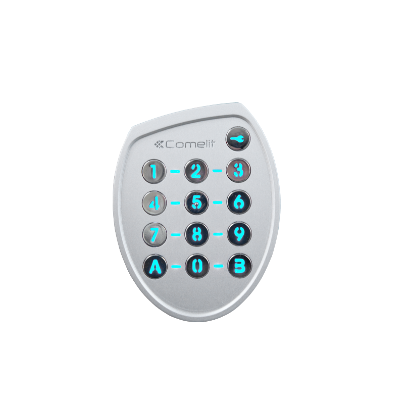 Chiave elettronica antivandalo a codice in zamak, 100 codici da 3 a 6 caratteri, tasti retroilluminati. Relè configurabili in modo monostabile da 1 a 99 secondi o bistabile. Gestione pulsante di uscita, orologio e allarme. Possibilità di relè esterno collegato su seriale RS485. Temperatura da -25°C a +55°C, IP54. Dimensioni 104 x 80 x 19 mm.