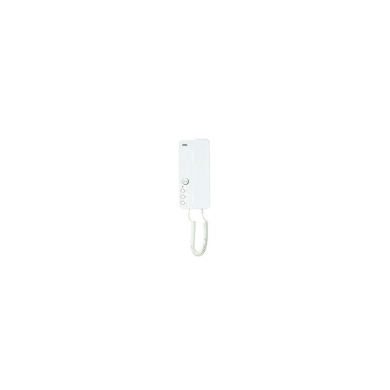 Citofono colore bianco lucido, dotato di pulsante apriporta (retroilluminato) e 3 pulsanti aggiuntivi per funzioni addizionali. Led di segnalazione delle varie funzionalità: chiamata attiva, funzione MUTE attiva, porta aperta, apriporta automatico attivo.