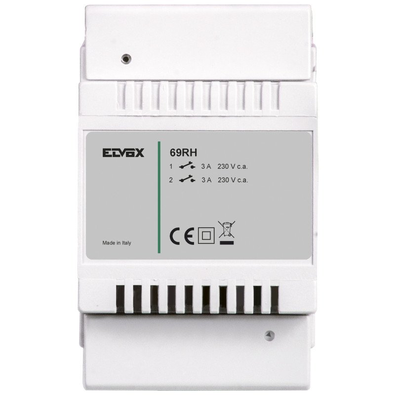 Dispositivo programmabile con 2 relè normalmente aperti 3 A 230 V~ per funzionamento come doppio relé temporizzato per l’attivazione di 2 servizi ausiliari indipendenti (tipo luce scale), fino a 8 dispositivi nello stesso impianto, installazione su guida DIN (60715 TH35), occupa 4 moduli da 17,5 mm.