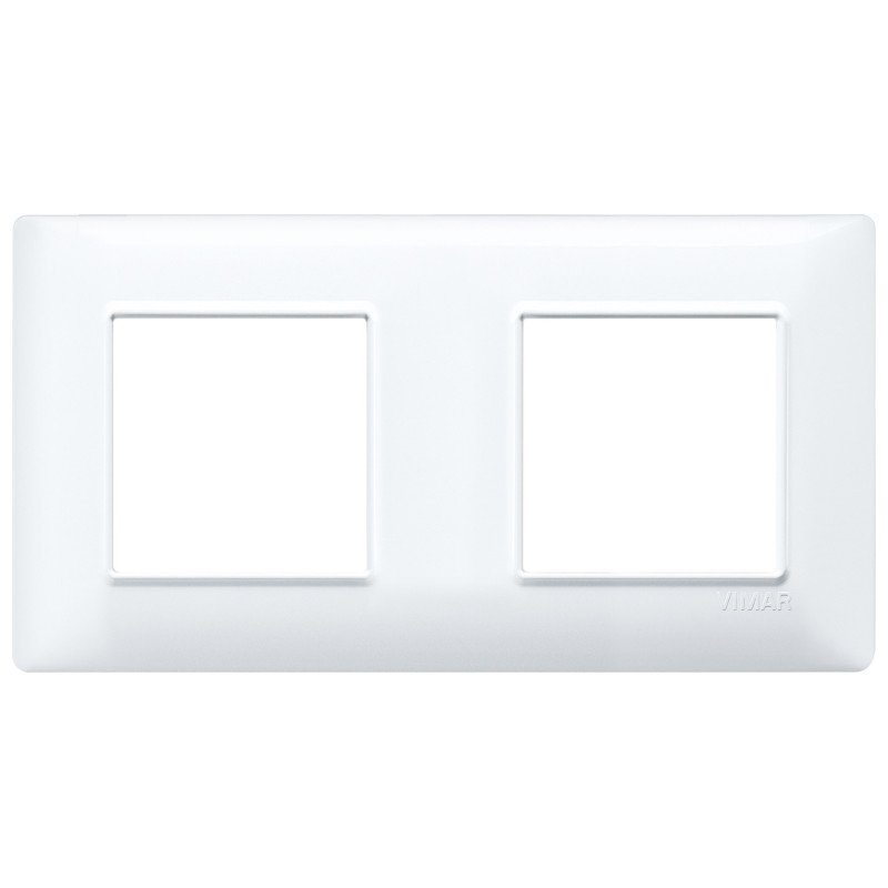Placca 4 moduli (2+2 interasse 71 mm), tecnopolimero, bianco. Dati tecnici: Direzione di montaggio: orizzontale e verticale. Con cornice di montaggio: sì. Adatto per scatola di canale sotterraneo: sì. Adatto per canale da incasso per apparecchi: sì. Adatto per installazione ad incasso: sì. Casella di testo/superficie di marcatura: sì. Materiale: plastica. Qualità del materiale: termoplastico. Senza alogeni: sì. Protezione della superficie: non trattato. Tipo superficie: lucido. Colore: bianco. Codice RAL (simile): 9016. Tipo di fissaggio: a morsetto. Dimensioni: Larghezza: 151 mm. Altezza: 80 mm. Profondità: 9 mm.