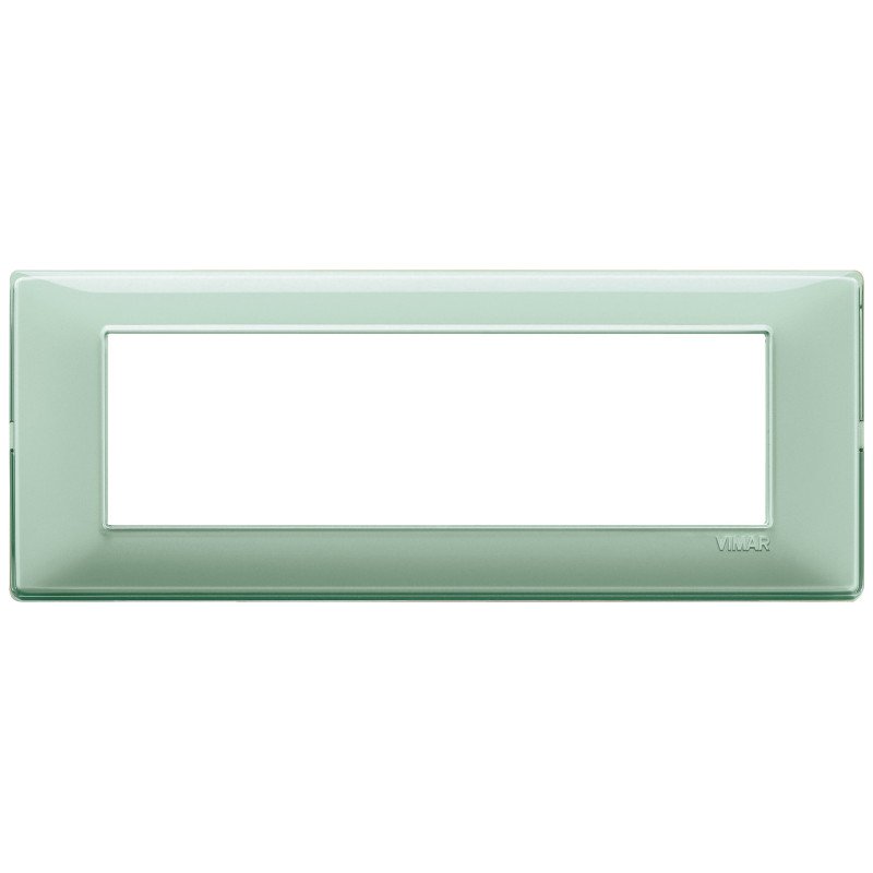 Placca 7 moduli, tecnopolimero, Reflex menta. Dati tecnici: Direzione di montaggio: orizzontale e verticale. Materiale: plastica. Qualità del materiale: vetro sintetico. Colore: verde ral 6019. Larghezza: 206mm. Altezza: 80mm. Profondità: 9mm.
