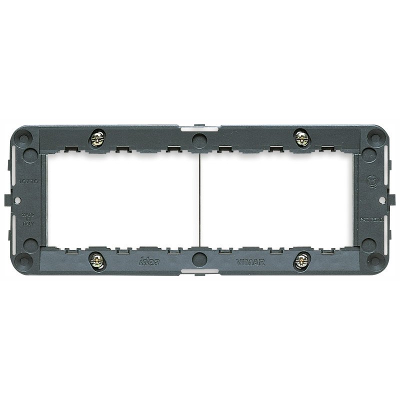 Supporto 6 moduli, con viti, per scatole 6/7 moduli, grigio. Dati tecnici: Tipologia Incassato. Tipo di montaggio Fissaggio con vite. Tipo di montaggio degli inserti moduli Dietro. Direzione di montaggio Orizzontale e verticale. Numero dei moduli in orizzontale (per costruzione modulare) 6. Numero dei moduli in verticale (per costruzione modulare) 1. Con scatola da incasso No. Con viti Sì. Adatto per montaggio in scatola da incasso rotonda 60 mm No. Montaggio a incasso Sì. Adatto per scatola di canale sotterraneo No. Adatto per canale da incasso per apparecchi No. Adatto per montaggio su guida DIN 35 mm No. Materiale Plastica. Qualità del materiale Materiale termoplastico.