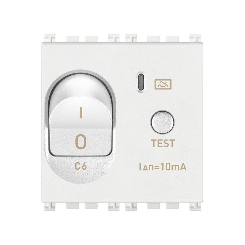 Interruttore automatico magnetotermico differenziale 1P+N C 6, 120-230 V~ 50-60 Hz, I?n 10 mA, p.i. 1500 A, bianco - 2 moduli. Numero di poli (totale) 2. Numero di poli protetti 1. Tensione nominale 230 V. Corrente nominale 6 A. Corrente di guasto nominale 6 A. Tipo di corrente di guasto A. Classe di limitazione energetica 1. Potere di interruzione nominale in cortocircuito secondo EN 61009-1 1,50 kA. Resistenza a corrente impulsiva 1,50 kA. Tipo di tensione di alimentazione AC. Frequenza 50/60 Hz. Caratteristica di intervento C. Conduttore neutro a connessione Sì. Categoria di sovratensione 3. Profondità di incasso 38,00 mm. Montaggio a incasso Sì. Protezione da scatto intempestivo No. Grado di protezione (IP) IP40.