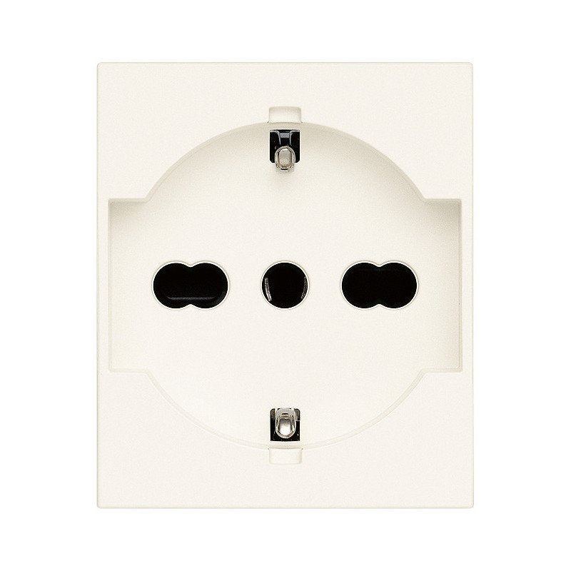 Presa SICURY 2P+T 16 A 250 V~ universale standard italiano P40, bianco - 2 moduli. Numero di unità 1. Numero moduli da frutto 2. Numero di fasi 1. Stampa/marcatura Altro. Tipo di collegamento Morsetto a vite. Con protezione dal contatto incrementata Sì. Colore Bianco. Codice RAL (simile) 9016. Alimentazione elettrica speciale Senza alimentazione elettrica speciale. Tipo di montaggio Incassato. Tipo di fissaggio Fissaggio a scatto. Materiale Plastica. Qualità del materiale Materiale termoplastico. Senza alogeni Sì. Tipo superficie Opaco. Corrente nominale 16 A. Tensione nominale 250 V. Frequenza 50,00 - 60,00 HZ. Adatto per classe di protezione (IP) IP20. Larghezza dell'apparecchio 44,80 mm. Altezza dell'apparecchio 52,80 mm. Profondità dell'apparecchio 36,10 mm.