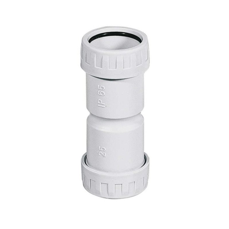 Il manicotto Elettrocanali ECMS25 ha un diametro di 25 mm e una lunghezza di 80 mm, viene utilizzato per unire tra loro due tubi protettivi rigidi serie RK di pari misura (entrambi di diametro 25 mm). Il tipo di materiale utilizzato è il tecnopolimero antiurto a base di PVC rigido, con grado di autoestinguenza V0 secondo la Norma UL94. Il colore di questi manicotti è grigio RAL 7035. La guarnizione interna rende questi manicotti stagni: il grado di protezione è IP 65, pertanto il giunto può essere utilizzato anche per impianti esterni.