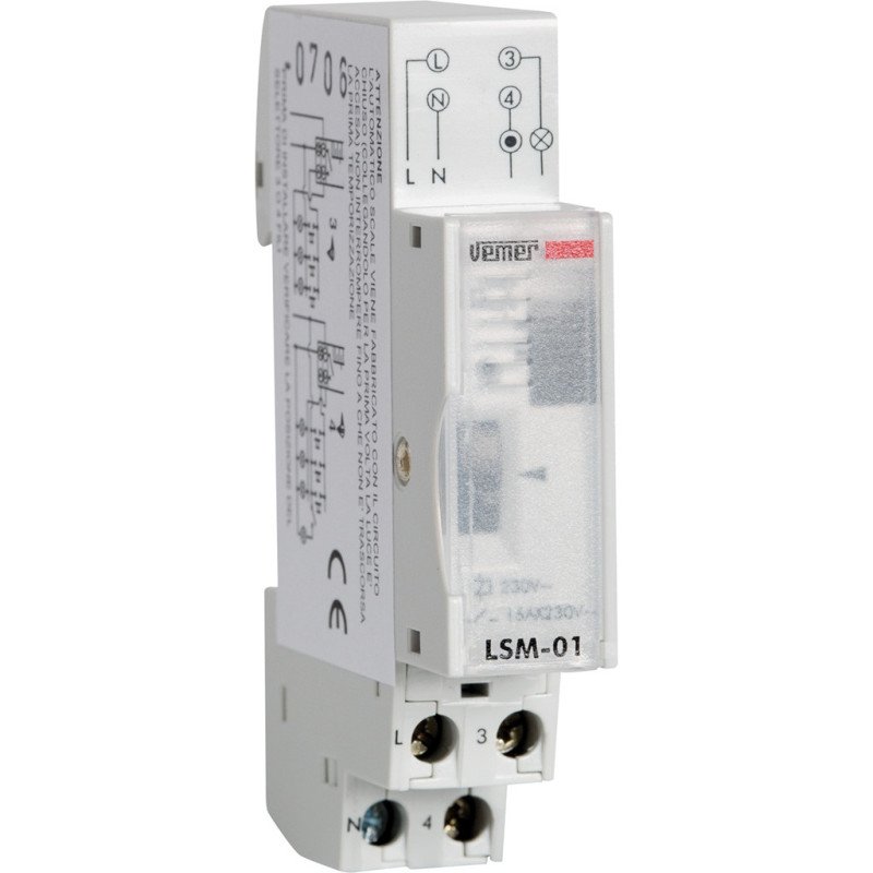 Temporizzatore elettromeccanico da barra DIN con selettore a due posizioni: automatico oppure acceso permanente. Particolarmente adatto per il controllo di luci scale. Caratteristiche Tecniche: Alimentazione 230V AC - 50/60Hz. Dimensioni 1 modulo DIN. Montaggio su barra DIN. Numero di relè 1.