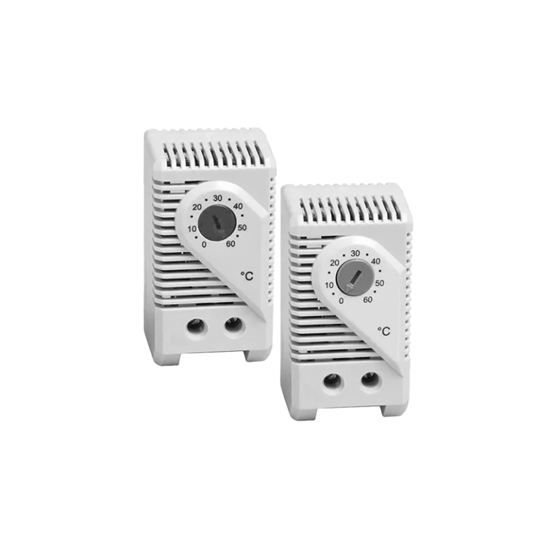 Termostati meccanici per apparecchi di riscaldamento e raffreddamento, ventilatori ed elementi di segnalazione. Il termostato, rilevando la temperatura ambiente, comanda i carichi ohmici e induttivi. Se la temperatura fissata è uguale al punto più alto di commutazione, il contatto NC si apre. Se la temperatura fissata, dedotta l’isteresi (e la tolleranza), è uguale al punto più basso di commutazione, il contatto NC si chiude. Isteresi di commutazione: Sonda: Tipo di contatto: Corrente di commutazione min.: Potere di apertura max: Contatto di apertura: Potere di apertura max: Contatto di chiusura: 5 K (tolleranza -3/+2 K). Bimetallo. A scambio (con contatti a scatto). 10 mA. 250 V AC. 10 (4)A. 120 V AC. 10 (4)A - 30 W DC. 250 V AC. 5 (2)A. 120 V AC. 5 (2)A - 30 W DC. Corrente di acc. max: 10 A AC per 10 sec. Connessione: Morsetto 4 poli, filo rigido 2,5 mmq, coppia di serr. max 0,5 Nm. Fissaggio: Alloggiamento: Dimensioni e peso: Temp. di funzionamento: Clip per guida DIN 35 mm EN60715. Plastica UL94-V-0, grigio. H67 x L50 x P38 mm - 0,1 Kg.-45°C - +65°C (-49°F - +149°F). Omologazioni: Classe di protezione: CE - VDE - UL File E164102. IP20.