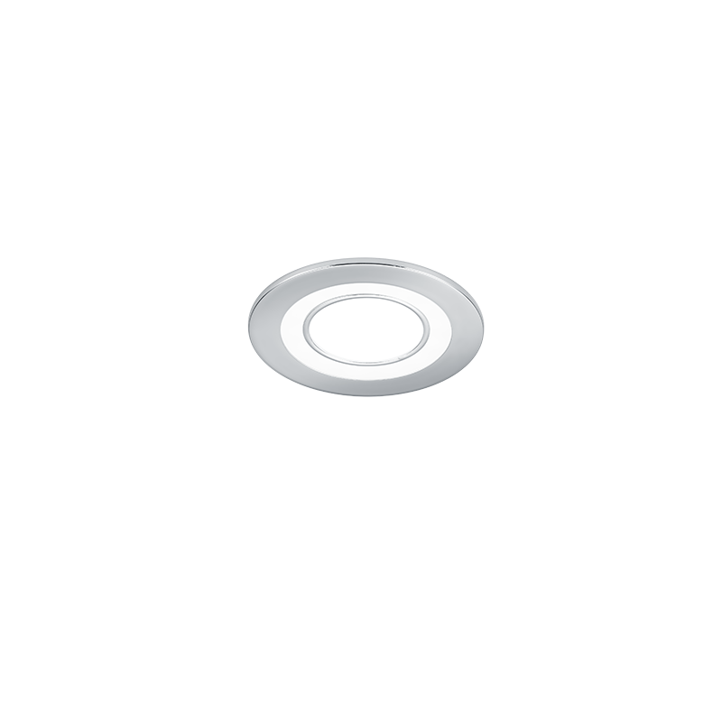 Lampadine SMD-LED (integrato). Watt 5W. Lumen 1x 450lm. Kelvin 3000K. Resa cromatica nominale > 80 CRI. Durata di vita 20000H. Cicli di commutazione 10000x ON/OFF. Tensione di esercizio 230V 50 Hz. Classe di protezione 2. Classificazione IP20. Colore cromo. Materiale plastica. Montaggio a soffitto, luminosità non regolabile, interruttori separati. Dimensioni: Altezza 3 cm. Diametro 8 cm. Misura foro per montaggio 6.8 cm. Profondità per montaggio 5 cm.