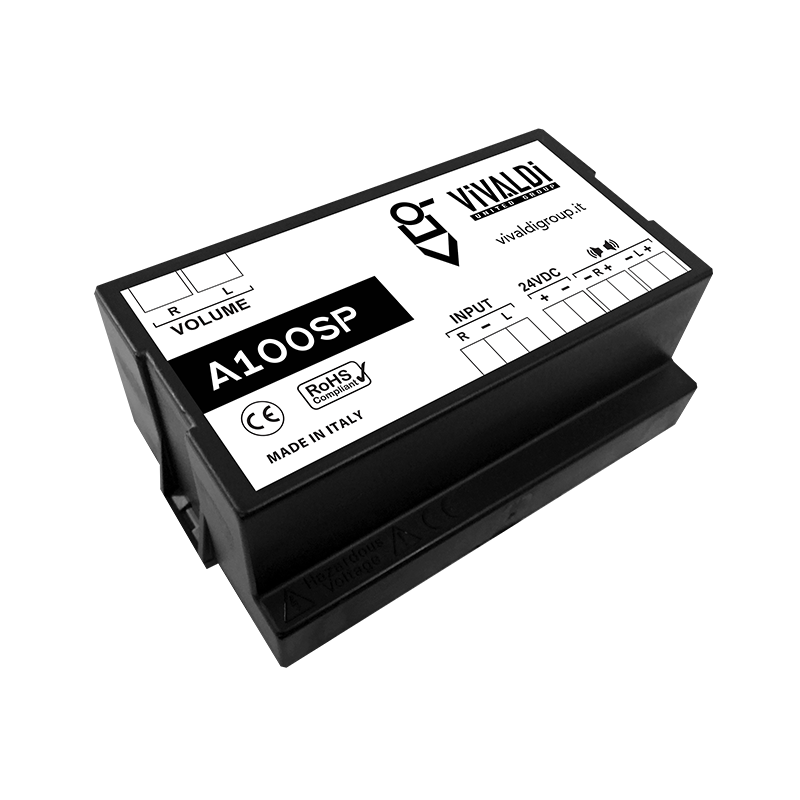 Caratteristiche del prodotto: - Amplificatore di potenza 50+50W RMS, stereo, con doppio trimmer. - Tensione 24 VDC. - Corrente 2,1A. - Potenza uscita stereo 50W + 50W RMS. - Impedenza minima 4O/canale. - 1x ingresso linea stereo. - Dimensioni 88x52x38 mm (LxHxP). - Peso 0,16Kg.