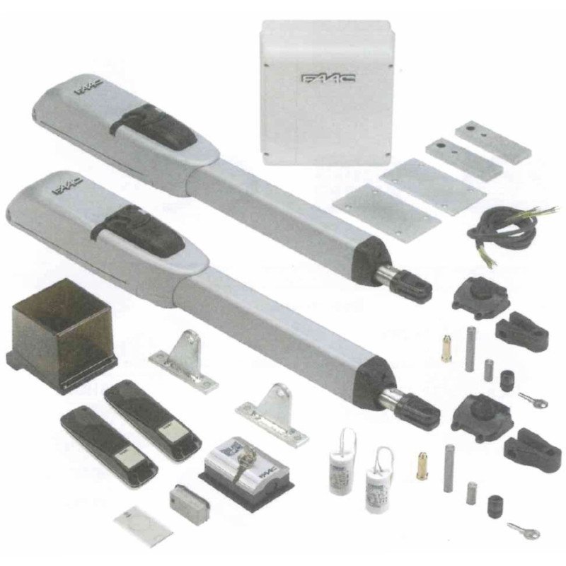 Kit per automazione elettromeccanica per cancelli a battente con anta di lunghezza fino a 2,5m ad uso residenziale, completo di: -2 1044151 attuatori 415 24V, velocita’ di uscita stelo 1,6cm_s. -1 790286 scheda elettronica E024S con contenitore. -1 410014 FAACLIGHT lampeggiatore 24V. -1 785103 XP 20B D coppia di fotocellule orientabile. -1 401019001-36 T10 E pulsante a chiave da esterno, versione da parete o colonnina. -1 319006 XF 433 MHz ricevente a scheda. -1 787007 XT2 433 SLH LR trasmittente 2 canali con codifica Self Learing Hopping codice che varia ad ogni utilizzo della trasmittente, un algoritmo riconosce e valida il segnale solo delle trasmittenti codificate dalla ricevente.