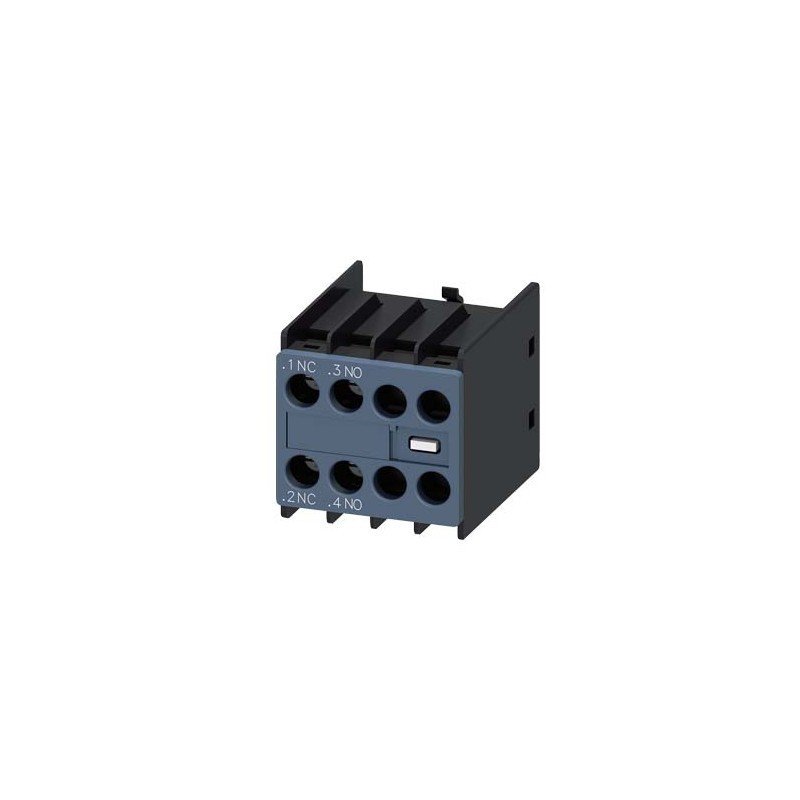 Blocchetto di contatti ausiliari sul lato frontale, 1 NO + 1 NC via di corrente 1 NC, 1 NO per 3RH2 e 3RT2 morsetto a vite .1/.2, .3/.4,contatto ausiliario SIRIUS 3RH29 per l'ampliamento dei contatti ausiliari nel circuito di comando. I blocchetti di contatti ausiliari frontali 3RH29 possono essere montati senza attrezzi indipendentemente dalla grandezza costruttiva sui contattori 3RT2 e sui contattori ausiliari 3RH2.