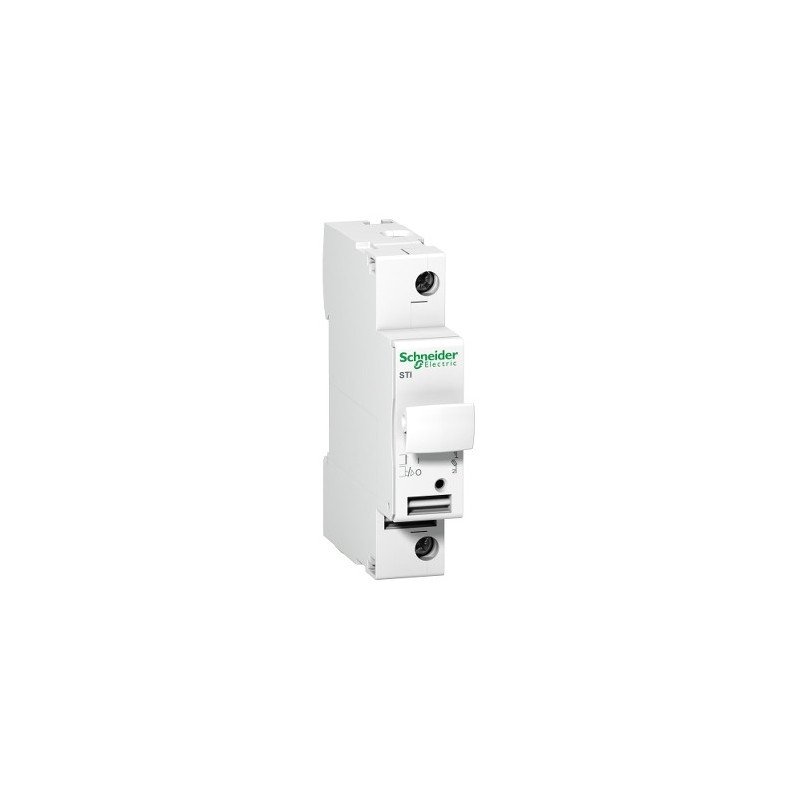 Questo portafusibili isolabili Acti9 STI è un sezionatore-fusibile a bassa tensione. Viene utilizzato per applicazioni terziarie e industriali che richiedono un'elevata capacità di interruzione. Ha un polo 1P, corrente nominale fino a 25A e curva dei fusibili gG o aM con un tipo di cartuccia dei fusibili di 10,3 mm x 38 mm. Può essere montato su guida DIN per l'installazione modulare. Il fusibile per uso generico (fusibile gG) fornisce protezione da sovraccarico e cortocircuito. Il fusibile aM per l'applicazione motore fornisce protezione da cortocircuito (protezione di carichi con un'elevata corrente di picco). Dispone di un grado di protezione IP20 sui terminali, arrivando a un grado IP40 una volta all'interno di un involucro modulare. Un marcatore a clip è visibile sul lato anteriore o sul terminale a valle per identificare la presenza del fusibile. Una spia al neon opzionale da 230V indica se il fusibile salta (spia spenta in condizioni di funzionamento normali e rosso acceso dopo che il fusibile salta). Il dispositivo è dotato di un portafusibile prigioniero e di un alloggiamento aggiuntivo per un fusibile di ricambio. La leva può anche essere lucchettata.