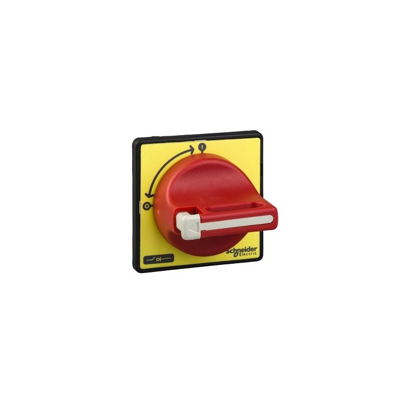 Manovra per interruttori-sezionatori TeSys Vario di Schneider Electric. Compatibile con interruttori VN12-VN20 e V02-V2, l'unità è dotata di una manovra gialla e rossa, di una piastra frontale 60x60 mm, fissaggio singolo. KCD1PZ è una manovra per interruttori-sezionatori TeSys Vario di Schneider Electric. Per il montaggio su porta, il dispositivo utilizza un interruttore chiuso VN12-VN20 o V02-V2 direttamente o attraverso un'estensione dell'albero. È destinato ad uso in caso di arresto di emergenza, assicura la protezione NEMA type 12 / IP65 ed è lucchettabile.