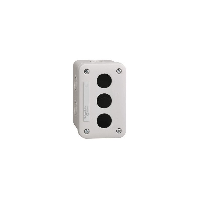 Harmony XALE3 è una pulsantiera vuota di colore grigio chiaro con 3 intagli. Il suo grado di protezione è IP54. Fa parte della gamma di pulsanti in plastica monoblocco Harmony XB7 di diametro 22 mm e lampade spia. Caratteristiche tecniche: Tipo prodotto Stazione di controllo vuota. Nome dispositivo XALE. applicazione prodotto Per unità di comando e segnalazione XB7 Ø 22 mm. Numero di fori 3 fori. Colore base della cassetta Grigio chiaro (RAL 7035). Colore coperchio Grigio chiaro (RAL 7035). Materiale ABS (acrilonitrile butadiene-stirene). Ingresso cavo 2 espulsori, capacità di serraggio: 20 mm. 6 espulsori per ISO M20. Grado di protezione IP IP54 conforme a CEI 60529.