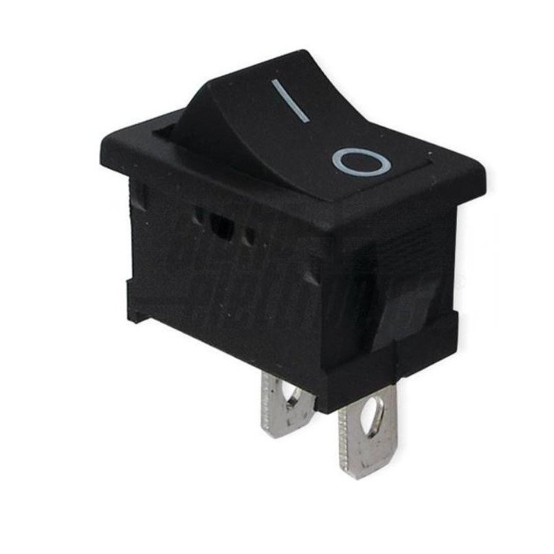 Interruttore - Nero - 1P - SPST - ON/OFF - 6A@250V - 2 term. faston 4,8. Attuatore Bilanciere. Colore Nero. Foro fissaggio 13mm x 19.2mm. Luminoso no. Materiale attuatore Plastica. Montaggio Pannello a incastro. N. poli 1. N. terminali 2. Serie Miniatura. Serigrafia I/O. Stato dei contatti ON/OFF. Tipi contatti SPST. Tipo terminale faston 4,8.
