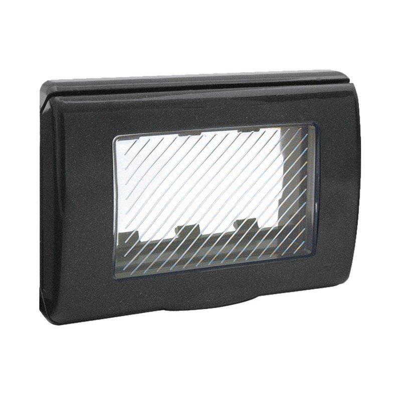 Placca 3 Mod.stagna (IP55) con membrana - autoportante (non necessita di armatura portafrutti) - grigio metallizzato. Dati tecnici: Colore: grigio. Larghezza: 120 mm. Altezza: 85 mm. Con coperchio a cerniera: Si. Trattamento superficie: metallico. Casella di testo/superficie di marcatura: No. Materiale: plastica. Tipo di fissaggio: fissaggio a vite. Direzione di montaggio: orizzontale. Codice RAL (simile): 9016. Resistenza agli urti: IK00. Grado di protezione (IP): IP55. Trasparente: Si. Tipo superficie: opaco. Adatto per canale da incasso per apparecchi: Si. Adatto per installazione su scatole da incasso: Si. Adatto per installazione a incasso: Si. Numero dei moduli in orizzontale (per costruzione modulare): 3. Numero dei moduli in verticale (per costruzione modulare): 1. Con cornice di montaggio: Si. Numero di elementi di commutazione: 0.