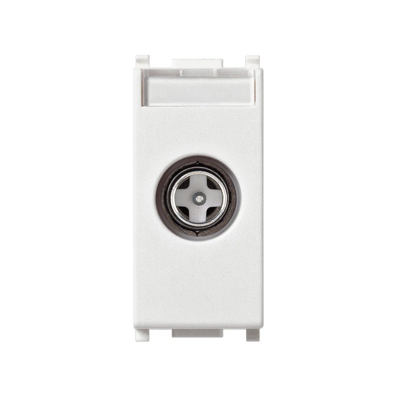 Presa coassiale TV-RD-SAT, 5-2400 MHz, diretta (derivata), con connettore maschio, attenuazione di derivazione 1 dB, bianco. Permette il passaggio di corrente continua e segnali di controllo (24 V 500 mA max). Dati tecnici: Tipo presa d'arrivo. Senza copertura. Attenuazione collegamento a 860 MHz 0,10 dB. Attenuazione collegamento a 2150 MHz 0,20 dB. Numero uscite 1. Adatto per alimentazione remota sì. Tipo di fissaggio a scatto. Colore bianco. Codice RAL (simile) 9003. Materiale plastica.