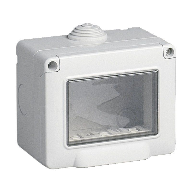 Contenitore da parete IP55, 3 moduli Eikon, Arké e Plana. Dati tecnici: Gruppo Materiale di connessione (elettrotecnico). Classe Supporto/fissaggio per pareti coibentate. Materiale Plastica. Superficie di fissaggio Altro. Con materiali di riempimento e isolanti Sì.