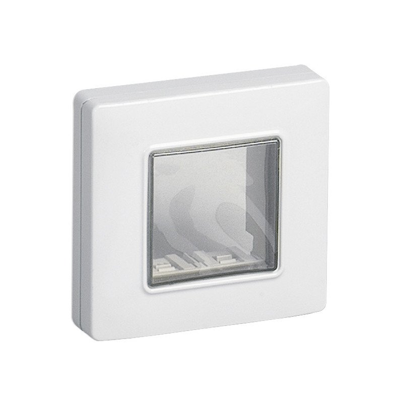 Calotta da parete IP55, 2 moduli Eikon, Arké e Plana, con griffe, per scatole da incasso ø 60 mm, bianco. Dati tecnici: Gruppo Materiale di connessione (elettrotecnico). Classe Supporto/fissaggio per pareti coibentate. Materiale Plastica. Superficie di fissaggio Altro. Con materiali di riempimento e isolanti Sì.