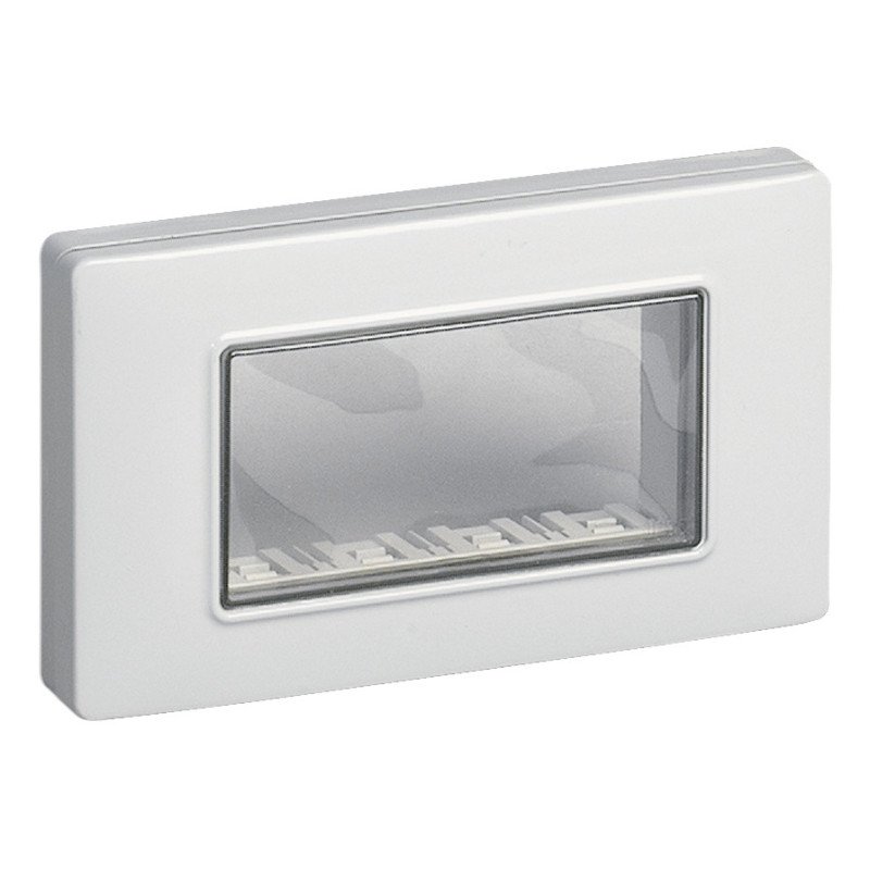 Calotta da parete IP55, 4 moduli Eikon, Arké e Plana, con viti, per scatole da incasso 4 moduli, grigio RAL 7035. Dati tecnici: Gruppo Materiale di connessione (elettrotecnico). Classe Supporto/fissaggio per pareti coibentate. Materiale Plastica. Superficie di fissaggio Altro. Con materiali di riempimento e isolanti Sì.