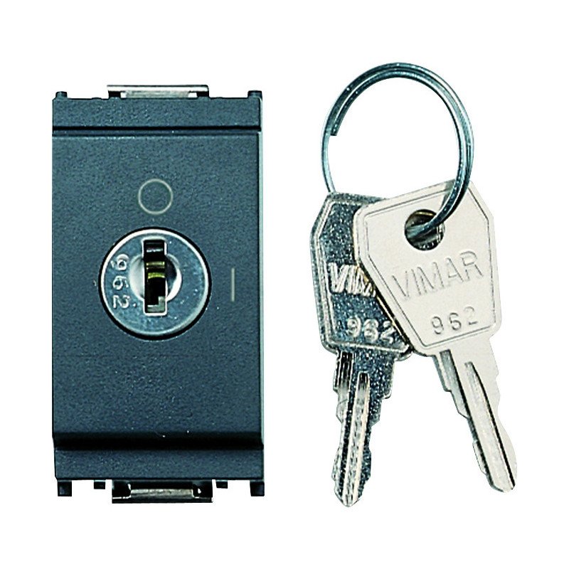 Interruttore 2P 16 AX 250 V~, a chiave, grigio. Max 200 W per lampade con alimentatore integrato (IEC 60669-1:2017). Dati tecnici: Composizione: dispositivo modulare per interruttori domestici. Tipo di comando: chiave. Numero moduli da frutto: 1. Tipo di montaggio e fissaggio: Incassato e bloccare in posizione. Materiale: plastica. Qualità del materiale: termoplastico. Senza alogeni: sì. Tipo superficie: opaco. Colore: grigio RAL 7015. Casella di testo/superifice marcatura: sì. Grado di protezione: IP40. Tensione nominale: 250V. Corrente nominale: 16A. Tipo di collegamento: morsetto a vite. Larghezza: 24,80 mm. Altezza: 50,10 mm. Profondità apparecchio: 32,80 mm. Profondità di incasso: 32,80mm.