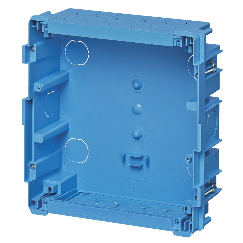 Scatola da incasso per centralino estetico 8 moduli (GW 850 °C) per pareti leggere, azzurro. Dimensioni 228x238x80 mm. Altezza 238 mm. Larghezza 228 mm. Profondità 80,00 mm. Profondità di incasso 80,00 mm. Profondità interna 78,00 mm. Numero di moduli 8. Numero di file 1. Numero moduli DIN 8. Numero di ingressi per conduttori 26. Materiale del corpo Plastica. Grado di protezione (IP) IP40. Classe di isolamento II.