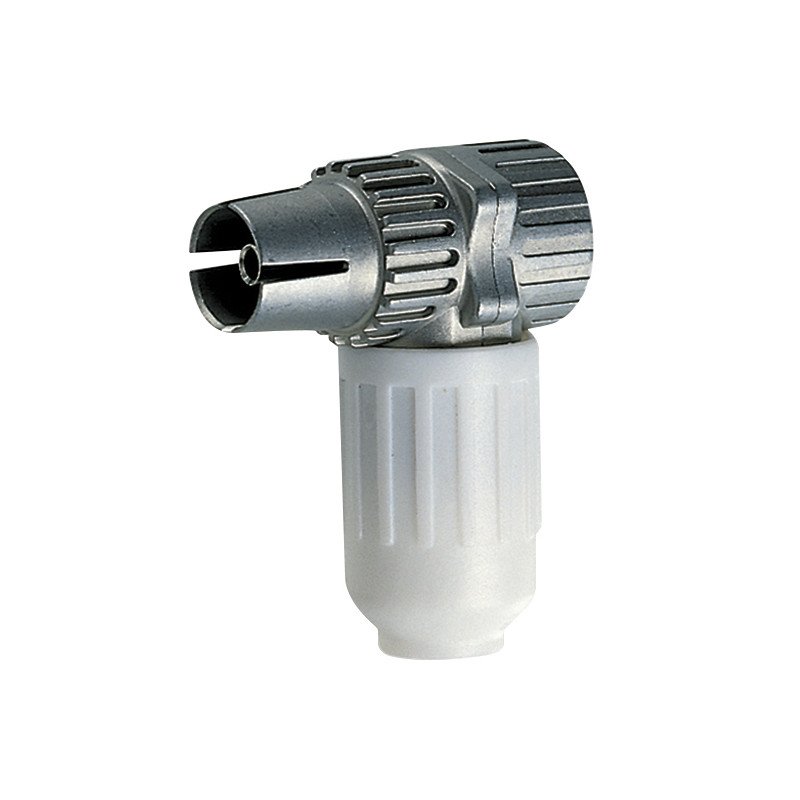 Connettore coassiale TV-RD-SAT femmina, uscita cavo 90°, bianco. Dati tecnici: Gruppo Materiale d'installazione per reti di comunicazione dnt/fnt. Classe Connettore coassiale. Tipologia Presa jack. Tipo di connettore Altro. Connettore angolare Sì. Esecuzione del contatto Femmina. Tipo di collegamento Altro. Tipo di cavo RG 59. Impendenza 75 Ohm. Montaggio isolato Sì.